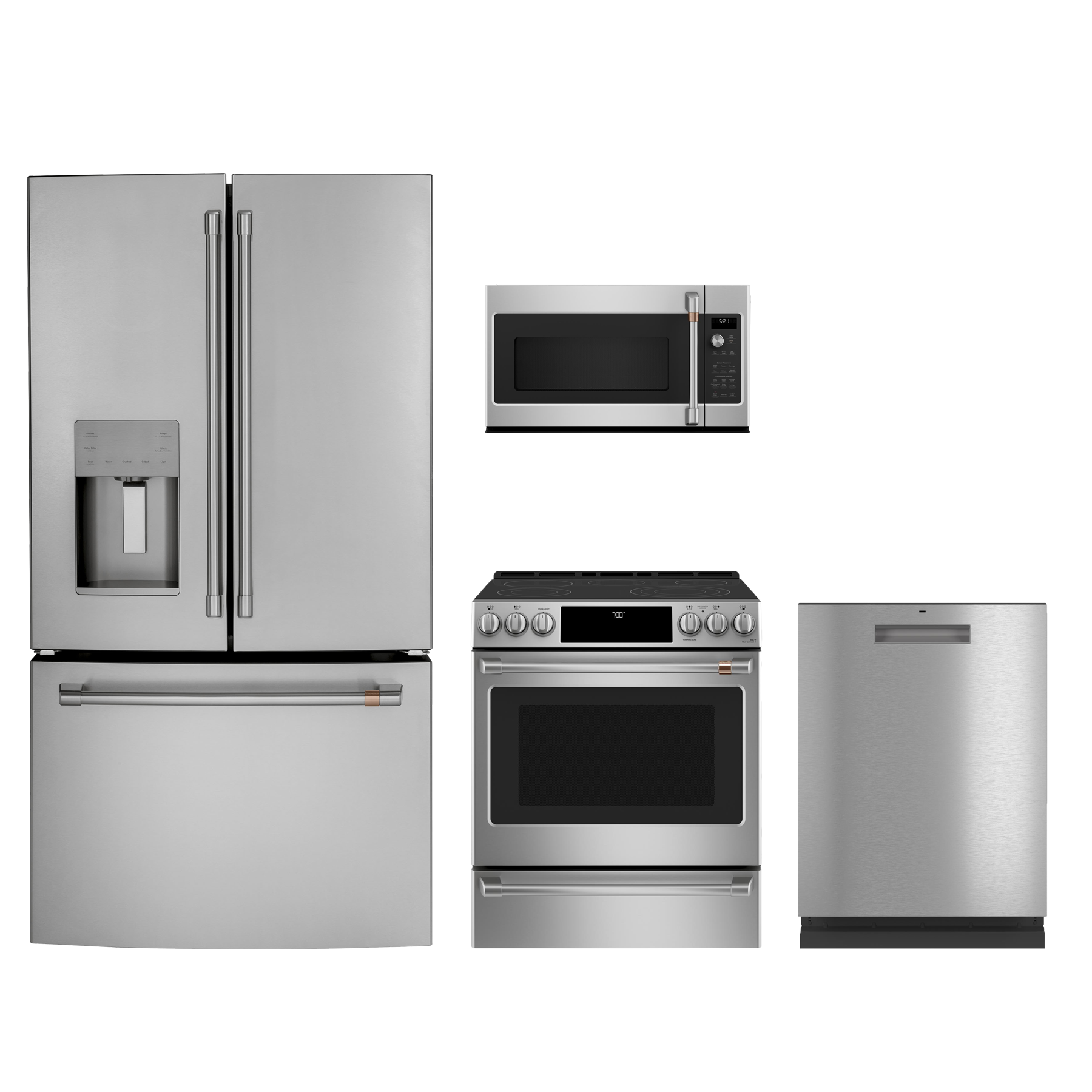 Cafe™ 4 Piece Kitchen Package-Stainless Steel with a french door refrigerator, slide in electric range, built in dishwasher and over the range microwaveRead More