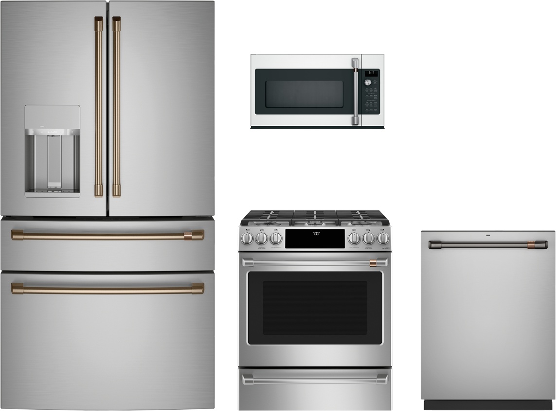 Café™ 4 Piece Kitchen Package-Stainless Steel with a French door refrigerator, slide-in gas range, built in dishwasher and over the range microwaveRead More