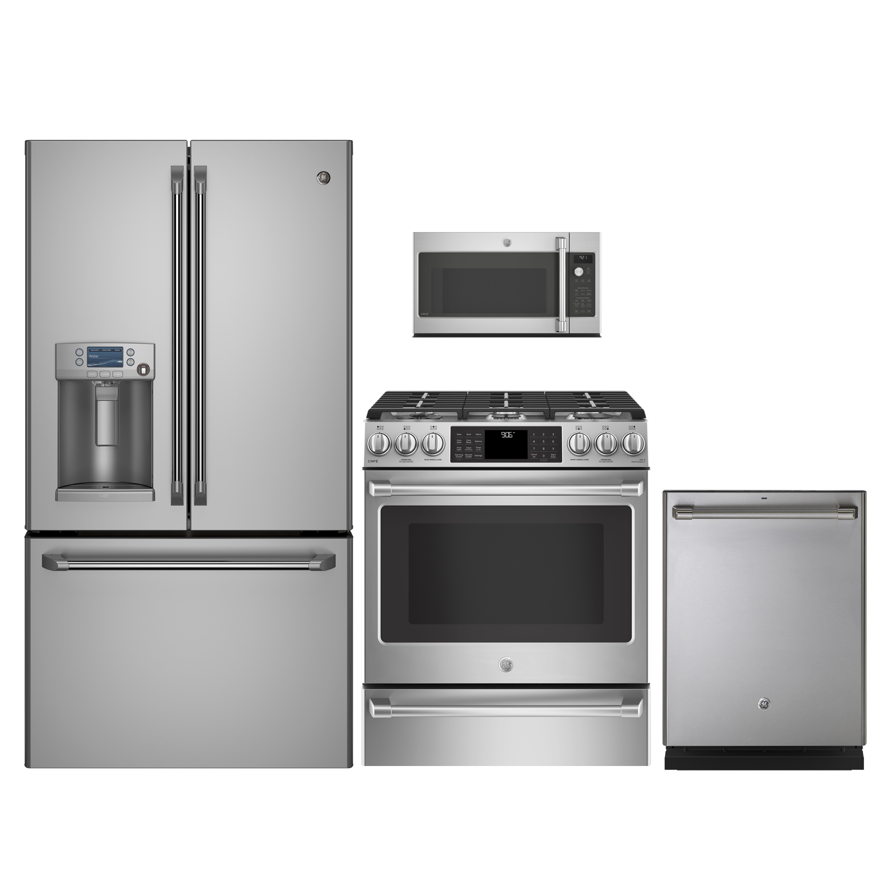 Cafe™ 4 Piece Kitchen Package-Stainless Steel with a counter depth french refrigerator, slide in gas range, built in dishwasher and over the range microwaveRead More