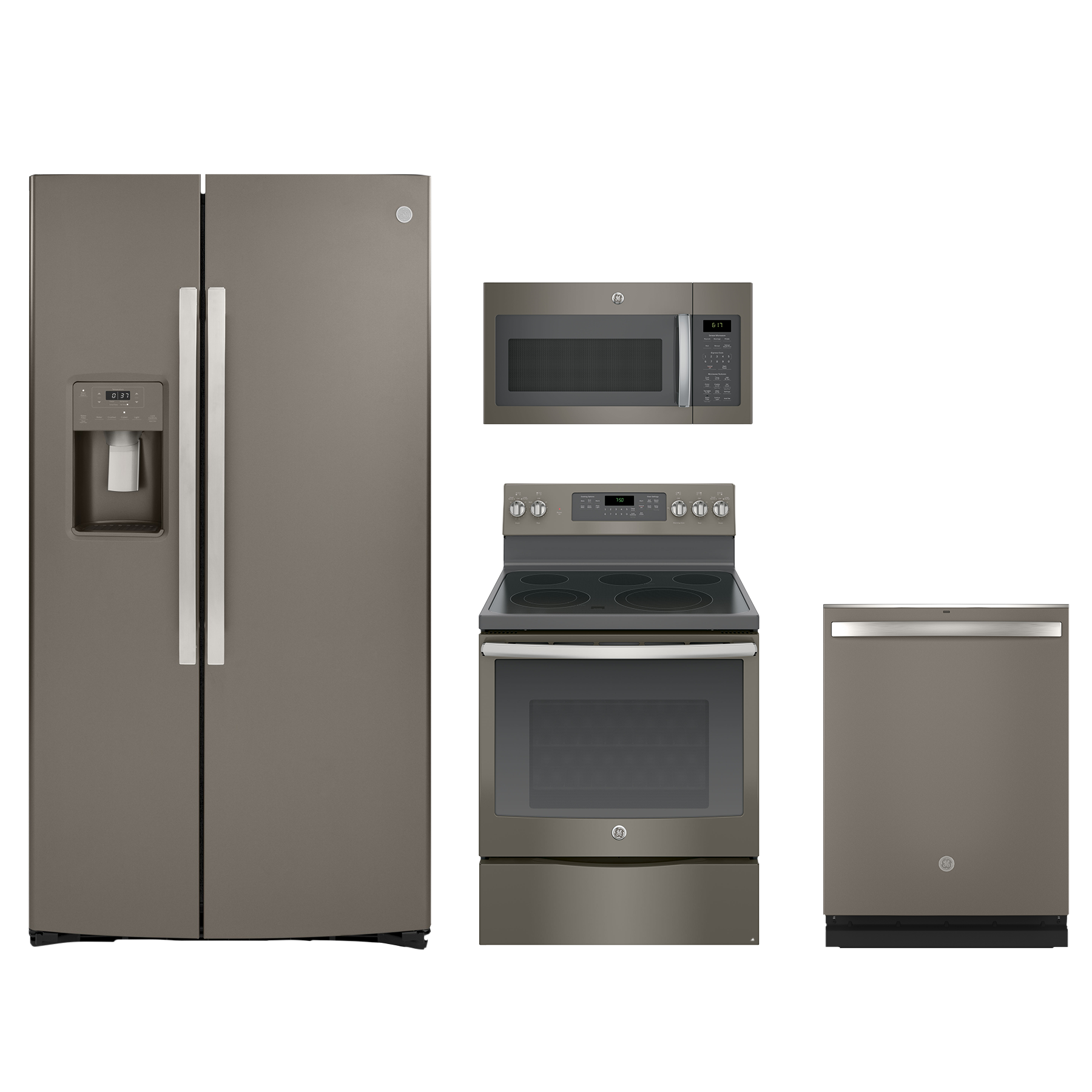 GE® 4 Piece Kitchen Package-Slate with a side by side refrigerator, free standing electric range, built in dishwasher and over the range microwaveRead More