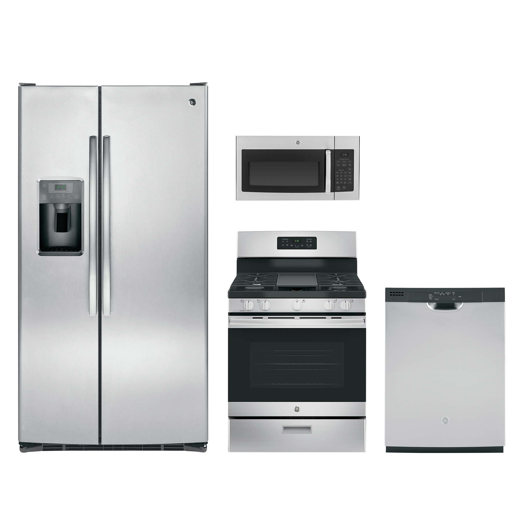 GE® 4 Piece Kitchen Package-Stainless Steel with a side-by-side refrigerator, free standing gas range, built-in dishwasher and over the range microwaveRead More