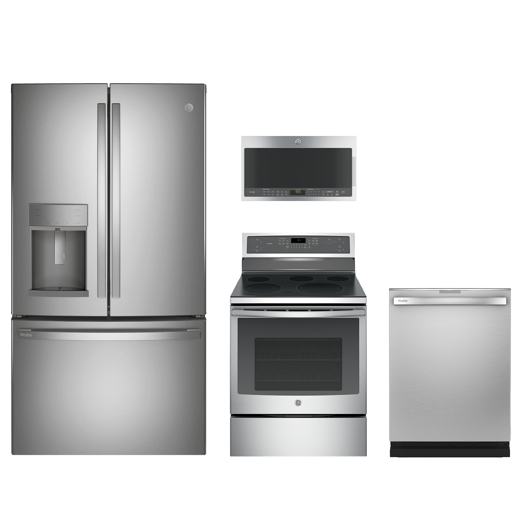 GE Profile™ 4 Piece Kitchen Package-Stainless Steel with a counter depth french door refrigerator, free standing electric range, built in dishwasher and over the range sensor microwave ovenRead More